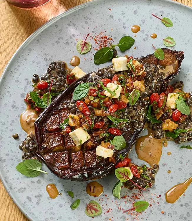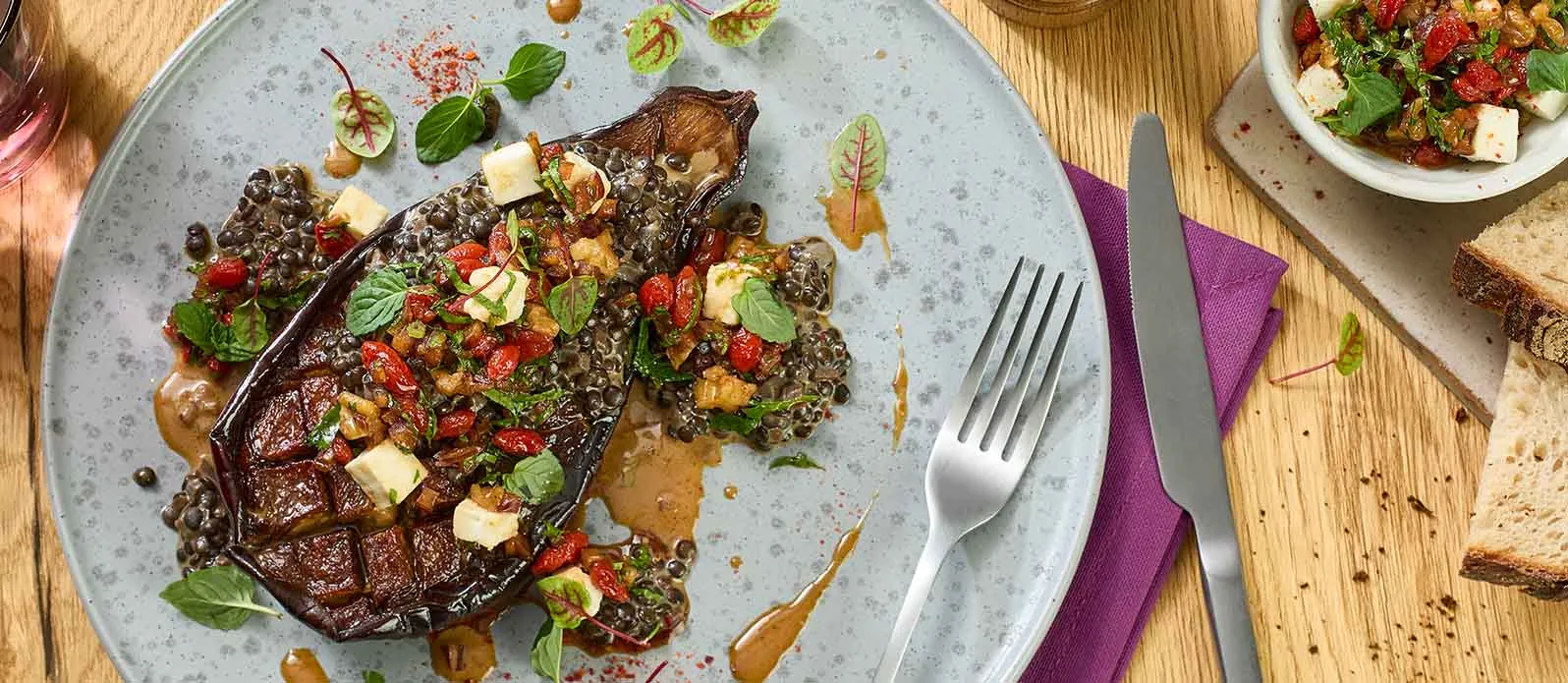 Ter voorbereiding op het serveren kunnen de aubergines van tevoren worden bedekt met de linzen en later worden geregenereerd in de oven of combisteamer. Voeg vlak voor het serveren de goji-topping en tuinkers toe.