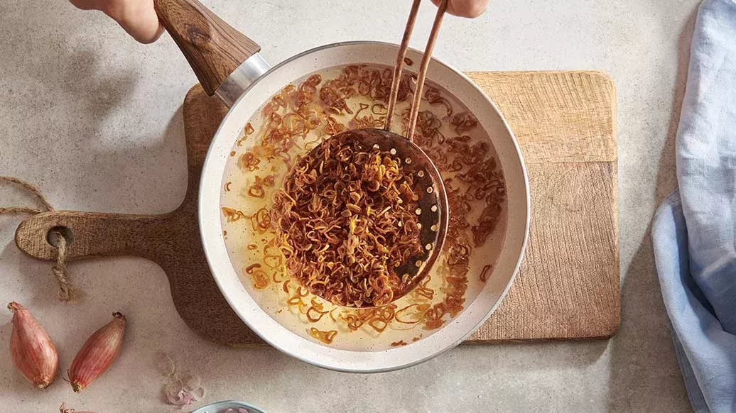 Snijd de sjalotten in plakjes en leg ze op keukenpapier. Bestrooi met twee snufjes zout en laat 10-15 minuten rusten, zodat het zout het vocht uit de sjalotten haalt. Verhit de olie in een pan of wok om te frituren. Doe de sjalotten in de olie en bak ze goudbruin. Haal ze uit de olie, laat ze uitlekken op droog papier en bestrooi ze met zout.