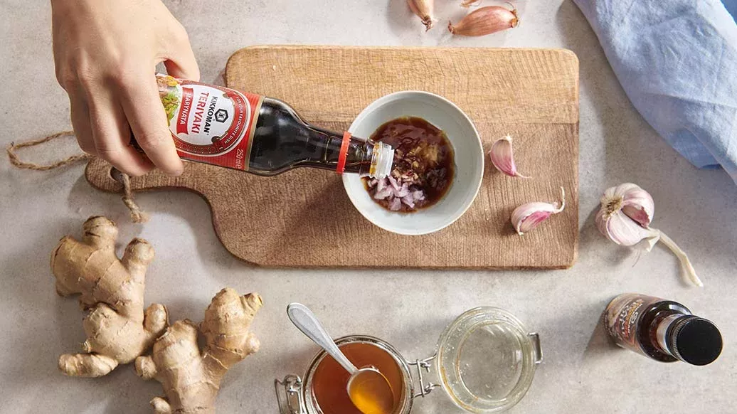 2 el Kikkoman Teriyaki Marinade – 1 el rijstazijn – 1 el honing – ¼ tl Kikkoman Geroosterde Sesamolie – ½ sjalotje – ½ tl gehakte knoflook – 1 tl ingemaakte gember