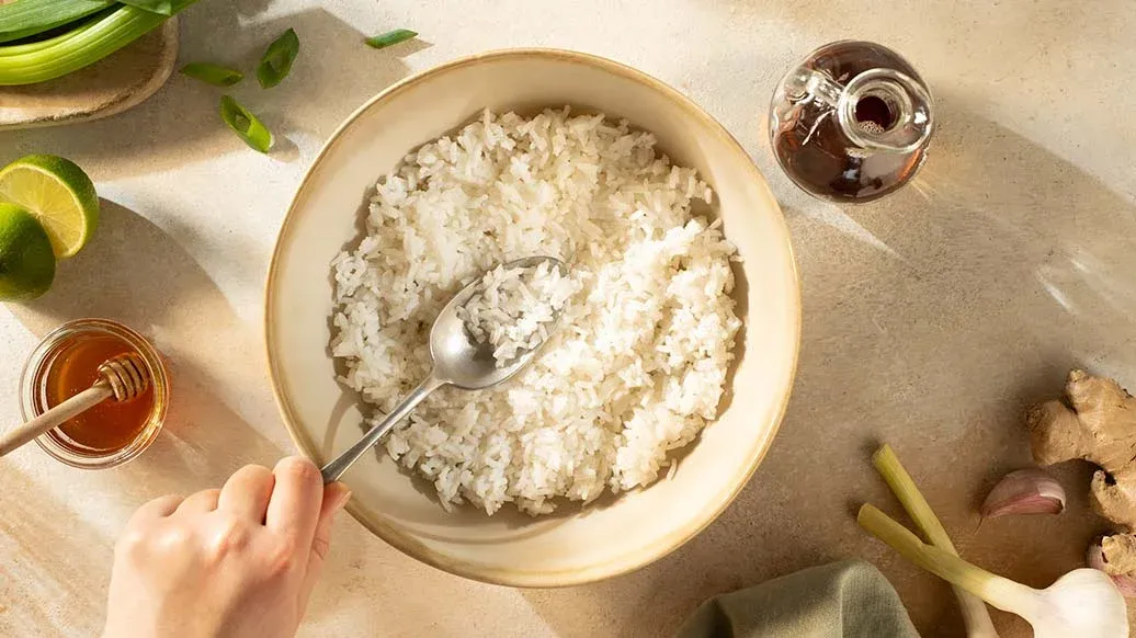 Aziatische rijstsalade met zoete sojasausdressing