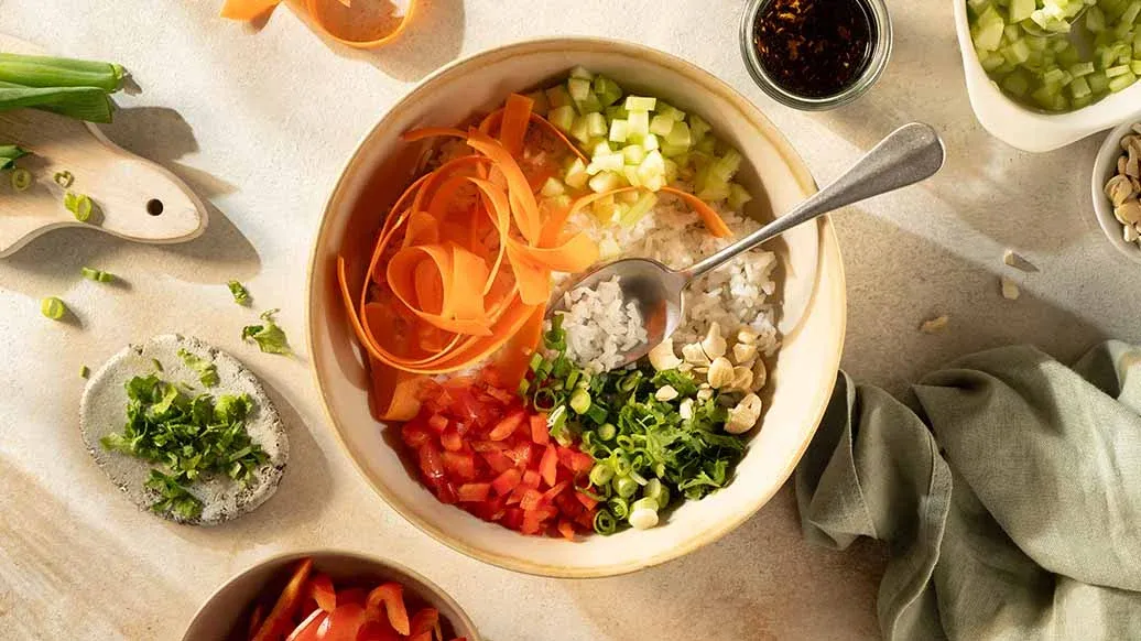 1 rode peper, fijngesneden – 1 komkommer, in kleine blokjes gesneden – 1 wortel, geraspt of in fijne blokjes gesneden – 4 lente-uitjes, fijngesneden (witte en groene delen) – 10 g gehakte koriander – 30 g gehakte pinda's of cashewnoten voor de crunch