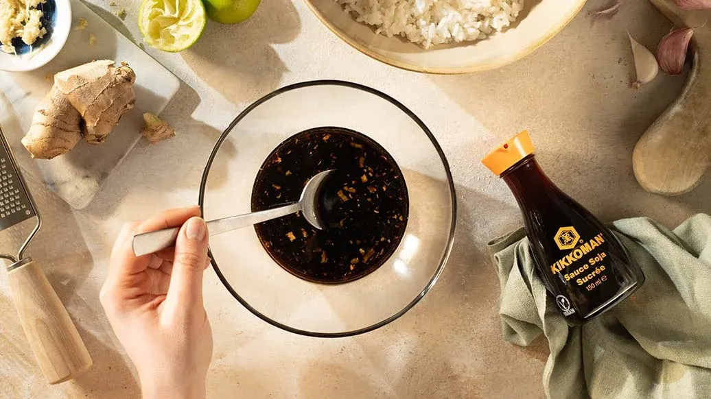 3 el Kikkoman zoete Sojasaus – 2 el Kikkoman Geroosterde Sesamolie – 1 el rijstazijn – 1 tl versgeraspte gember – 1 klein teentje knoflook, geperst of zeer fijn gehakt – 1 el honing of ahornsiroop – ½ limoen (voor sap)
