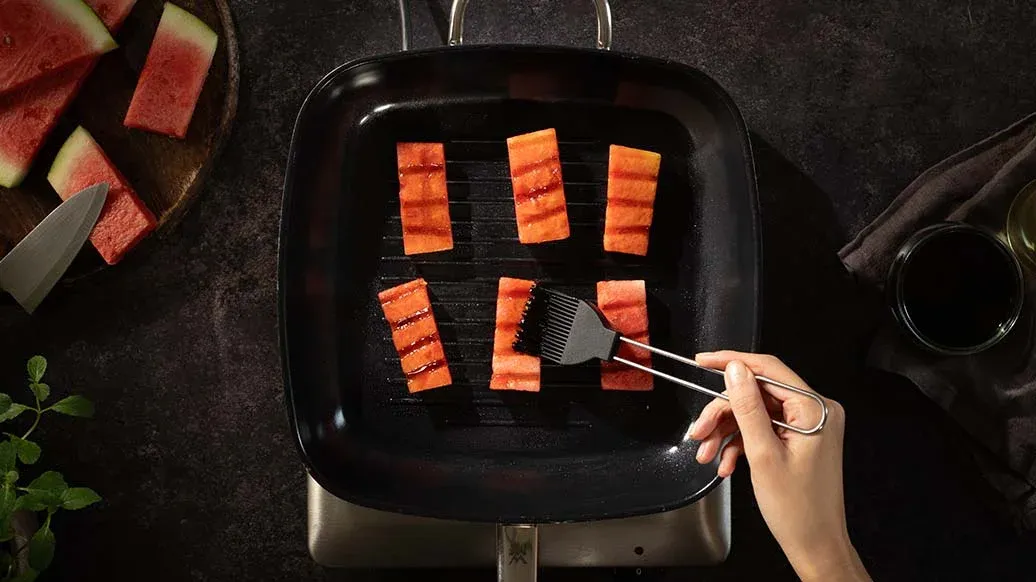 Bestrijk een grillpan of barbecue licht met olie. Gril de watermeloenplakken op middelhoog vuur aan beide kanten, zet vervolgens het vuur lager, bestrijk ze met de Kikkoman Teriyaki BBQ-saus Met Honing en draai ze om. Herhaal dit een paar keer tot de watermeloen mooi geglaceerd is.
