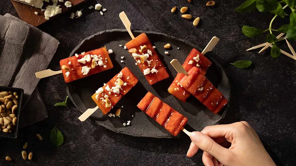 Een fris voorgerechtje. Onze meloensticks in de vorm van ijsjes zijn ideaal voor feestjes: bereid alles van tevoren voor en grill en glaceer ze tijdens het feest.