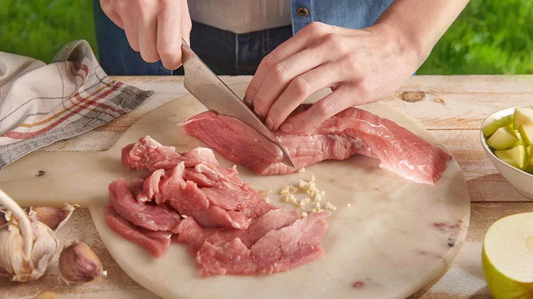 Snijd het vlees in dunne plakjes. Snijd de knoflook, appel, gember en lente-uitjes in grove stukjes.