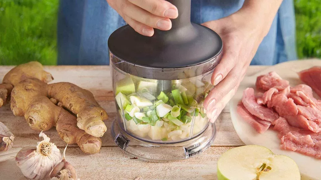Doe de gehakte knoflook, appel, gember en lente-uitjes in een keukenmachine of blender. Pureer tot een gladde pasta.