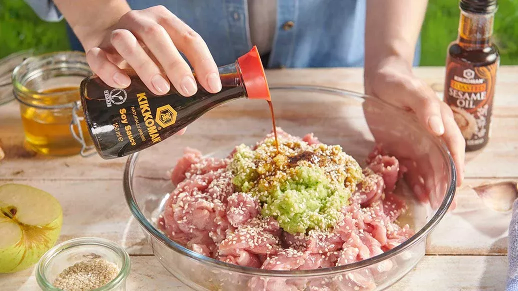 Voeg de saus van stap 2 en de overige ingrediënten (Kikkoman Sesamolie, honing, peper, Kikkoman Sojasaus en geroosterde sesamzaadjes) toe aan het gesneden vlees. Marineer het geheel minstens 1 uur, maar bij voorkeur een hele nacht.