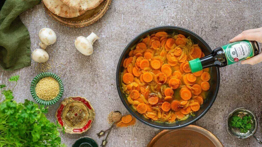 Snijd de wortelen en de ui in dunne plakjes, meng ze met de kruiden en de door een knoflookpers geperste knoflook en fruit ze in olijfolie. Giet het water erbij en laat op een laag vuur sudderen tot het zacht is. Breng op smaak met Kikkoman Natuurlijk Gebrouwen Sojasaus Met Minder Zout en mix tot een gladde saus.