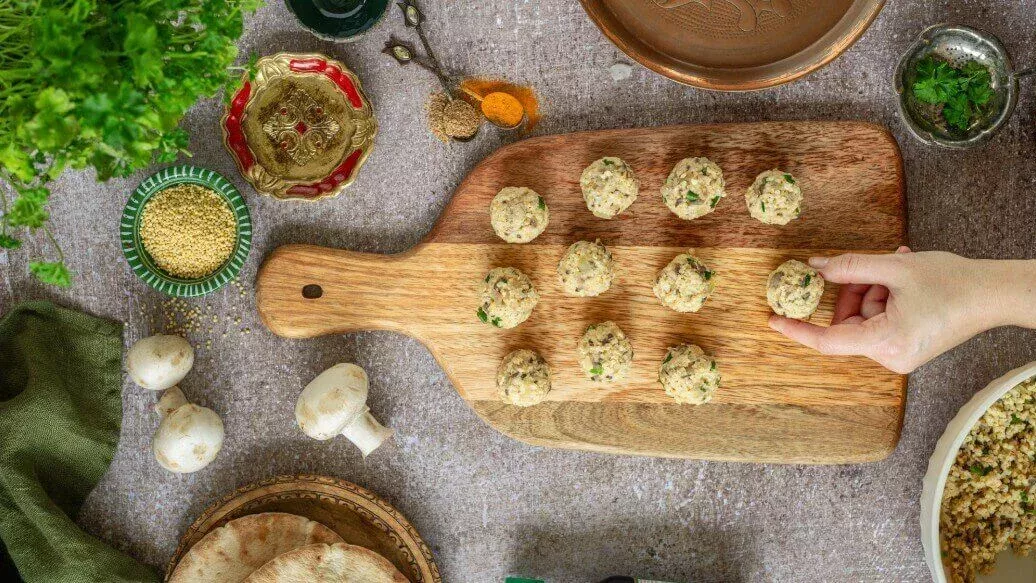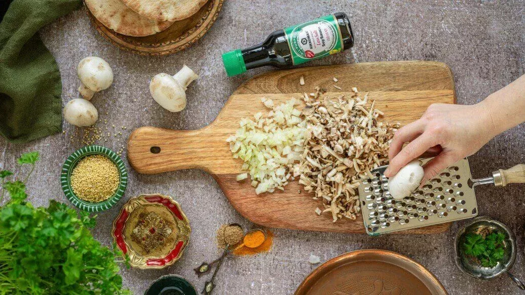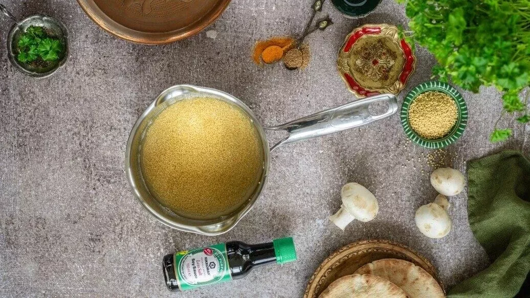 Voeg de champignons en ui toe aan de gekookte gierst, gevolgd door de kruiden, peper en Kikkoman Natuurlijk Gebrouwen Sojasaus Met Minder Zout. Meng alles en vorm er kleine burgertjes van. Bak ze goudbruin in olie. Serveer met wortelsaus, gehakte jalapeñopeper, peterselie en couscous.
