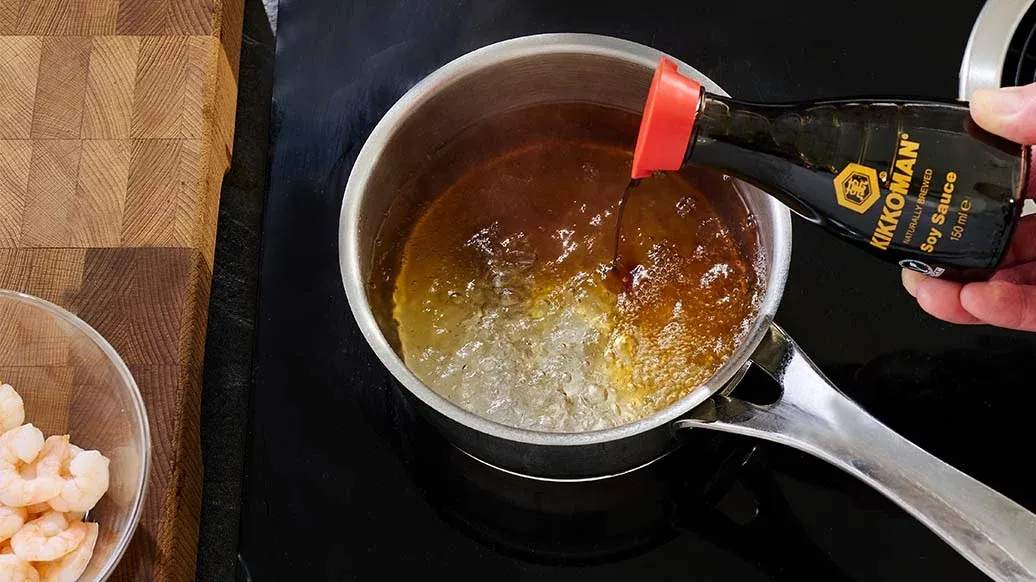 10 sugarsnaps – Zout – 80 g kant-en-klare garnalen – 1 el Kikkoman Natuurlijk Gebrouwen Sojasaus