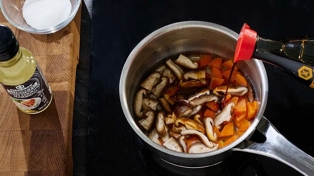 Doe de wortel en champignons in een steelpan met de Kikkoman Sojasaus, Kikkoman Mirin-Stijl Zoet Koken Kruiden, 150 ml water en de suiker. Breng aan de kook en laat ongeveer 5 minuten sudderen.