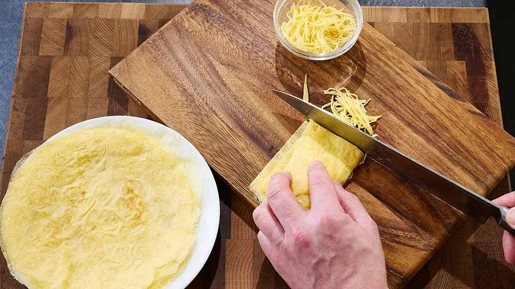 Maak vier dunne omeletten van het mengsel, laat afkoelen en snijd in dunne reepjes.
