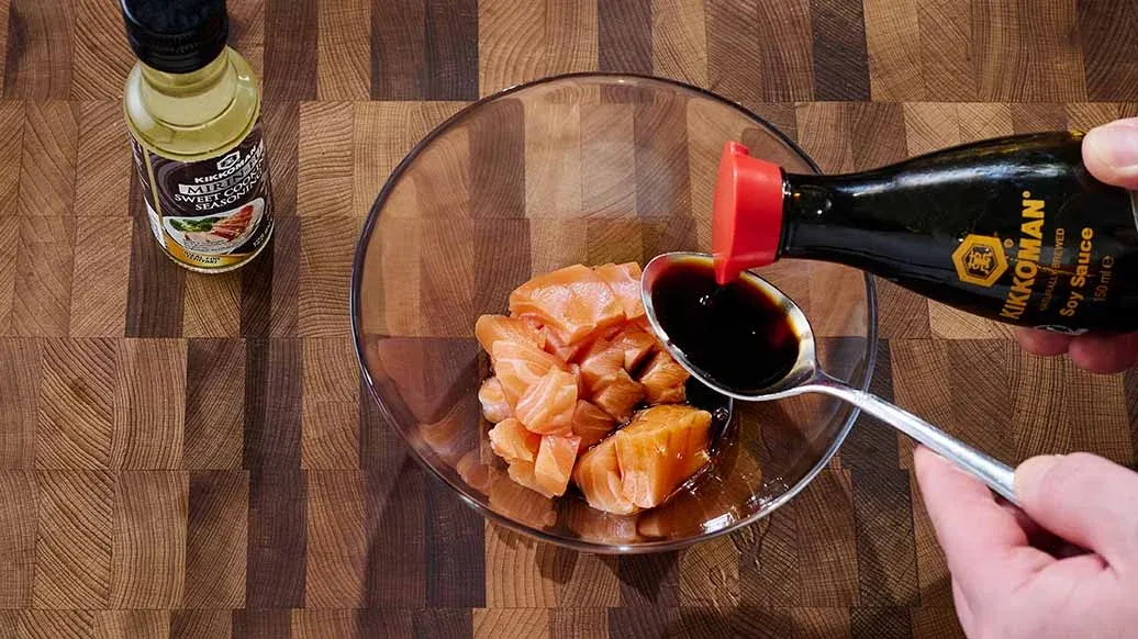 Snijd de zalm in kleine stukjes en marineer 15 minuten in de Kikkoman Sojasaus en Kikkoman Mirin-Stijl Zoet Koken Kruiden. Snijd de avocado in blokjes.