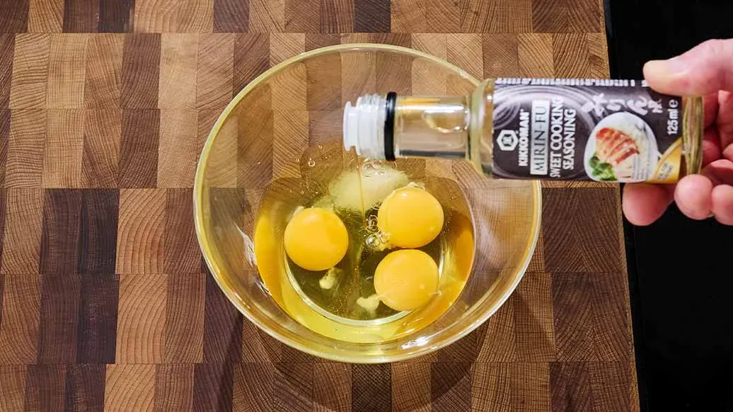 Klop de eieren, Kikkoman Mirin‑Stijl Zoet Koken Kruiden en suiker door elkaar.