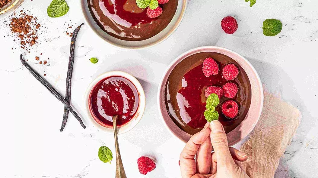 Garneer de pudding gerust met je favoriete fruit, zoals aardbeien, bramen of kersen. Kersen kunnen gewoon gepureerd worden zonder de saus te zeven.