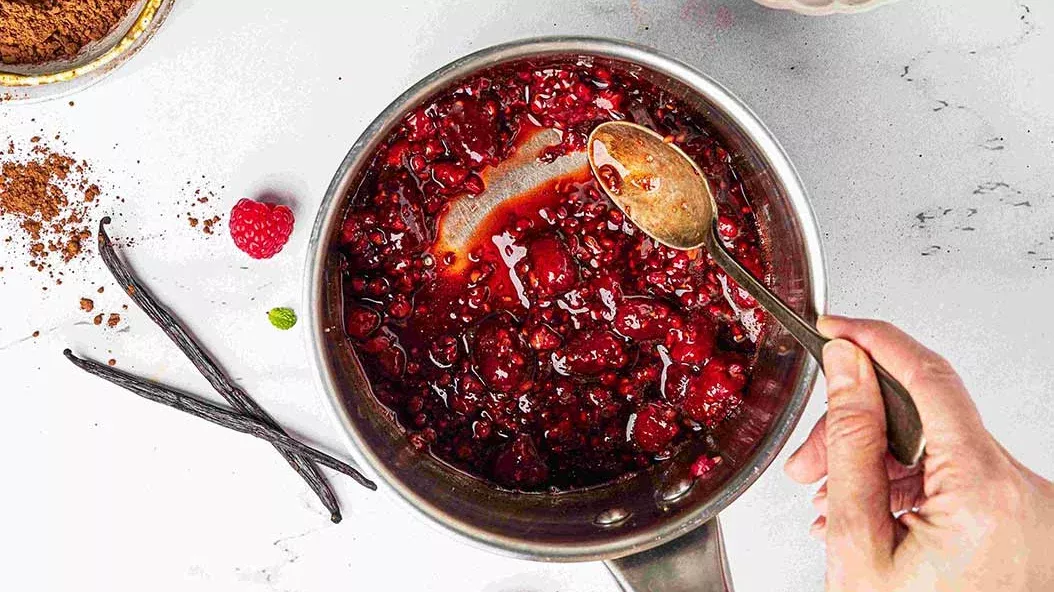 Doe de frambozen, suiker en Kikkoman Tamari Glutenvrije Sojasaus in een pan en verwarm tot de frambozen beginnen te breken. Giet het mengsel dan door een zeef.