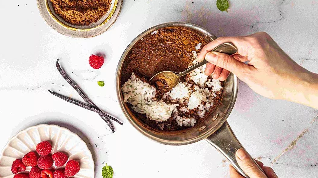 Verwarm de melk met de cacao en het vanille-extract. Voeg de rijst toe en verwarm het geheel.