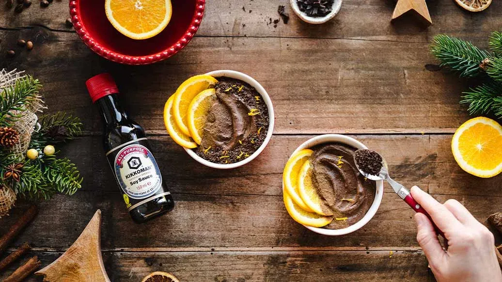 Een luchtige mousse van pure chocolade en espresso, verrijkt met een scheutje Kikkoman Sojasaus voor een subtiele, hartige twist. Gegarneerd met sinaasappelschil, kaneel en geraspte chocolade voor een heerlijke en toch elegante afsluiting van elke feestelijke maaltijd.