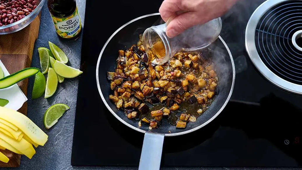 Snijd de aubergine en sjalot in kleine blokjes en hak de knoflook fijn. Verhit 1 el olijfolie en bak de aubergine, sjalot en knoflook goudbruin. Blus af met de azijn en de Kikkoman Ponzu Citroen. Roer de lijnzaadolie erdoor en breng op smaak met peper.