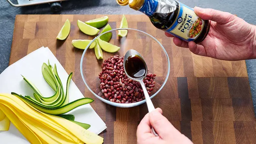 Snijd de courgette in de lengte in plakjes of reepjes. Marineer de azukibonen in de Kikkoman Pokesaus. Snijd de limoen in acht partjes.