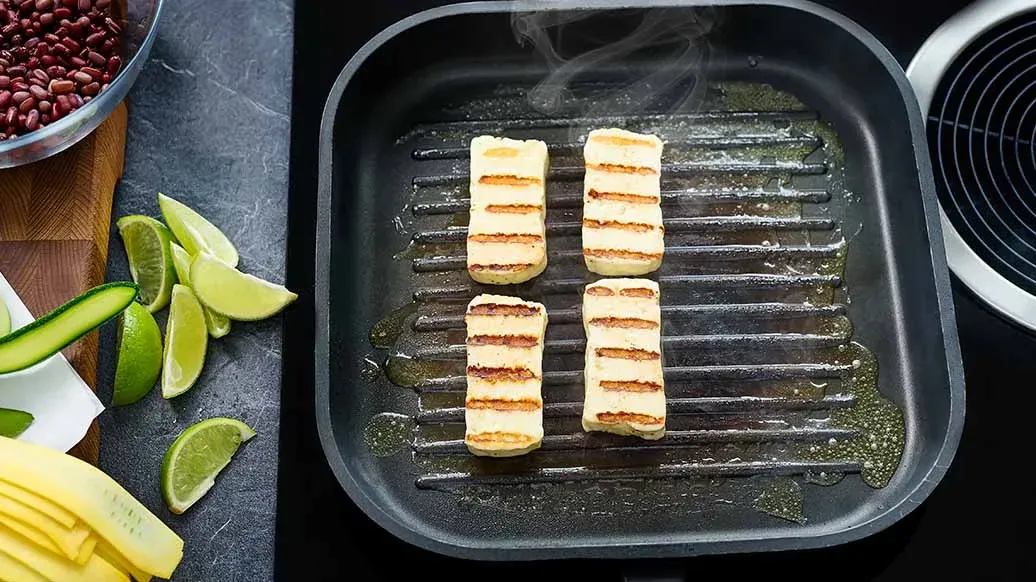 Deze courgette-, azukiboon- en halloumisalade met een warme auberginevinaigrette op basis van Kikkoman Ponzu Citroen is perfect voor de lunch, als gezond tussendoortje op kantoor of voor een tuinfeestje. Fris, lekker en snel klaar.