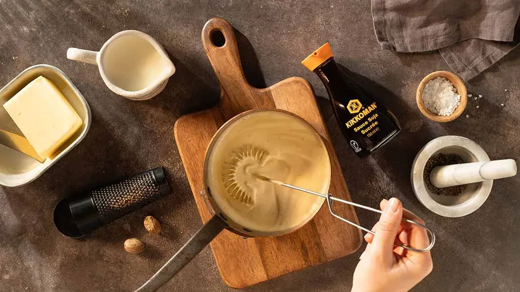 1 el boter – 1 el bloem – 180 ml melk – 1 el Kikkoman zoete Sojasaus – 1 snufje nootmuskaat – Zout en versgemalen peper naar smaak