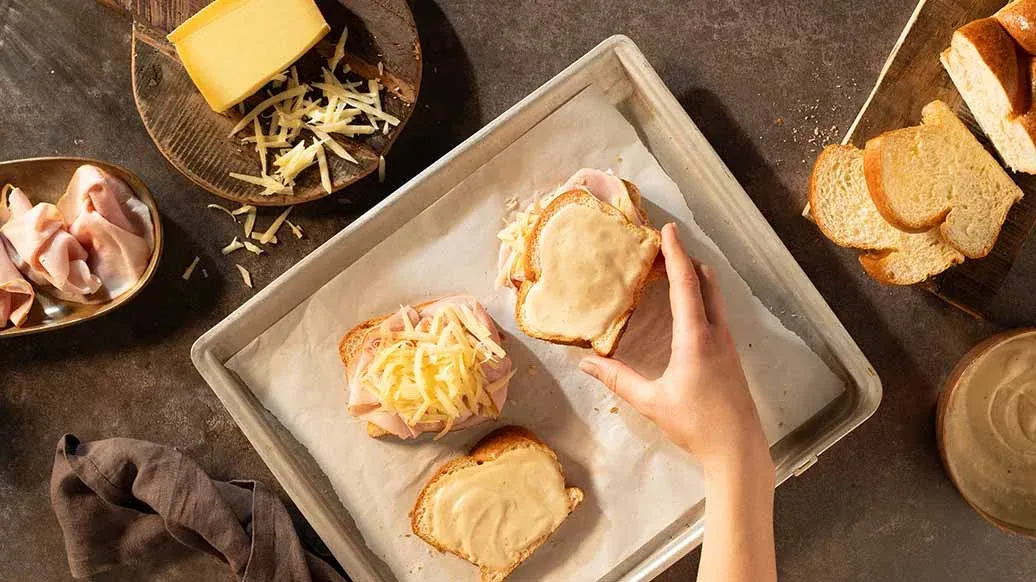 Smeer de bechamelsaus op één kant van elk sneetje brood. Leg de helft van de kaas en de ham op 2 sneetjes en leg de rest van de boterhammen erop met de sauskant naar boven. Breng over naar een bakplaat, smeer er meer bechamelsaus over en bestrooi met de rest van de kaas. Bak ongeveer 12 minuten in een op 180°C voorverwarmde oven. Serveer direct, bijvoorbeeld met een groene salade en vinaigrette.
