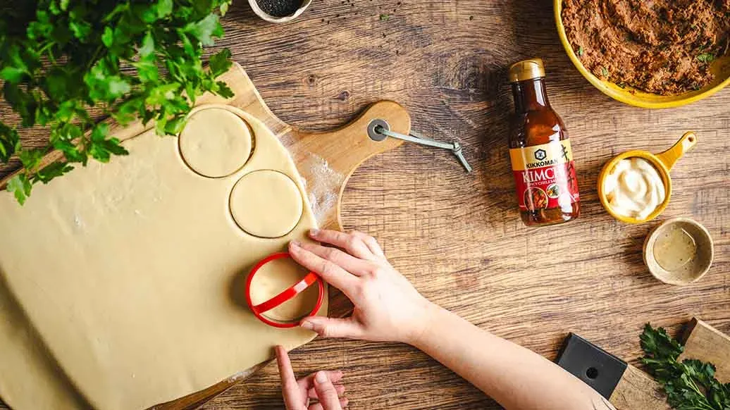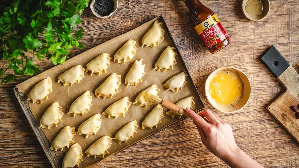 Je kunt de Kikkoman Kimchi Chilisaus in de vulling vervangen door 1 el sriracha gemengd met 1 el Kikkoman Sojasaus. Het deeg kan ook worden vervangen door kant-en-klaar bladerdeeg.