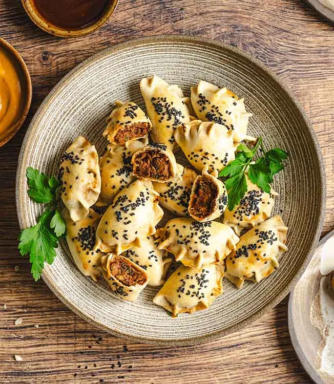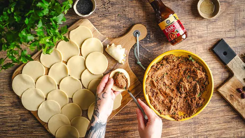 Knapperig gebakken empanadas gevuld met een hartige mix van tonijn, bonen en zongedroogde tomaten. Kikkoman Kimchi Chilisaus – zowel als dip als in de vulling gebruikt – voegt een milde pittigheid en rijke smaak toe.