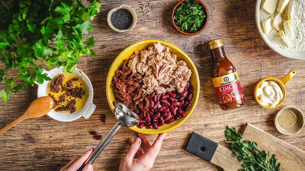 Laat de tonijn uitlekken en mix deze met de bonen en zongedroogde tomaten tot een licht grove pasta. Meng de peterselie en Kikkoman Kimchi Chilisaus erdoor.
