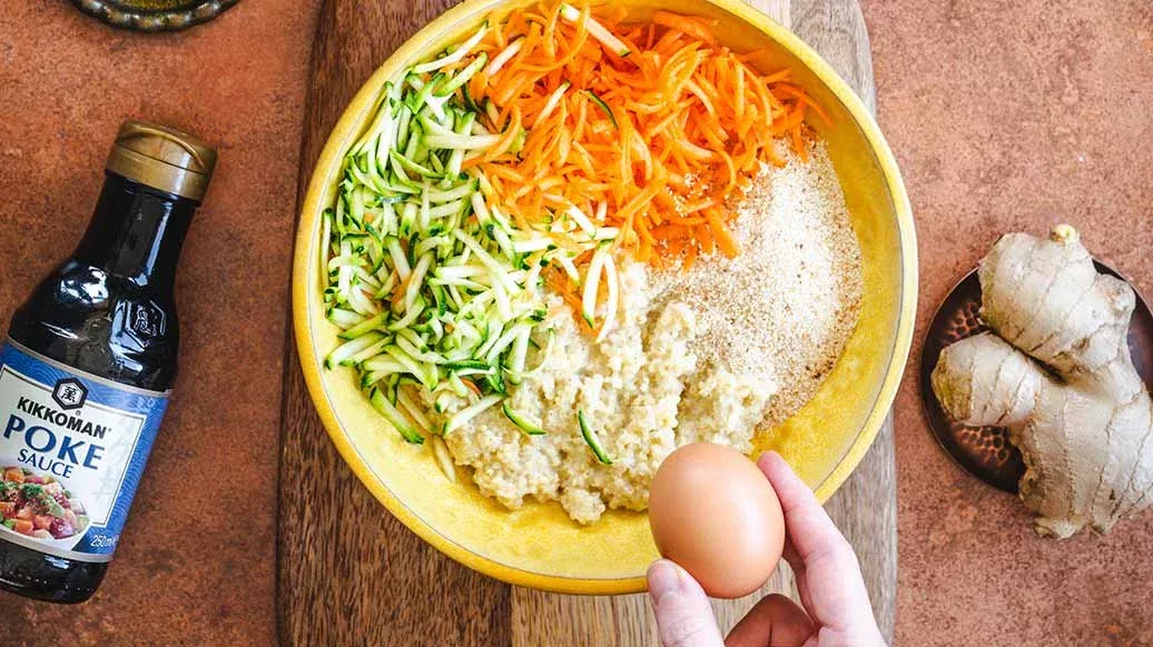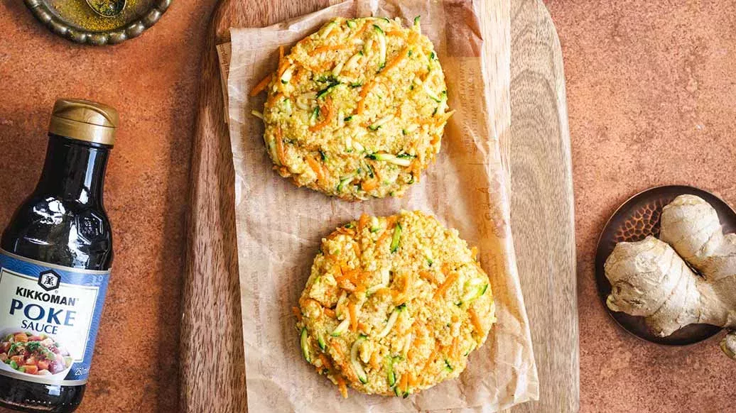 Kruid het mengsel van stap 1 met de kerrie, kurkuma, gember en Kikkoman Poke Saus. Vorm hier 2 burgers van en bak deze aan beide kanten in olijfolie.