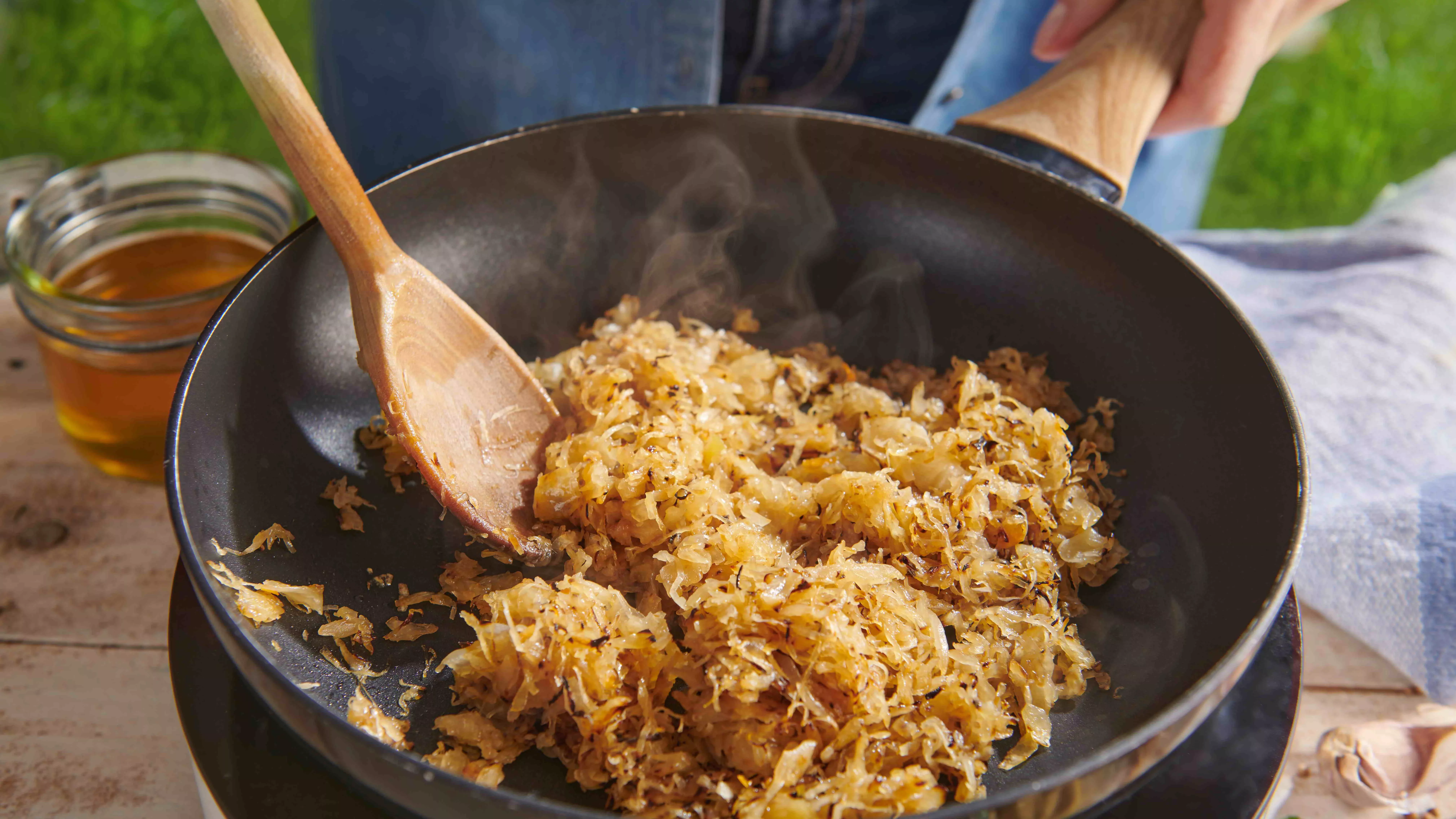 Serveer de plakjes vlees met de gebakken zuurkool en in plakjes gesneden augurk op een boterham besmeerd met mosterd.