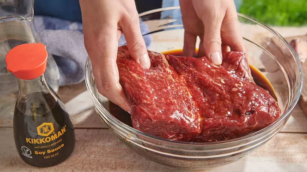Meng de bruine suiker, Kikkoman Sojasaus, Kikkoman Mirin-Stijl Zoet Koken Kruiden en het water. Leg het vlees in de marinade en zet het 1 - 2 dagen in de koelkast.