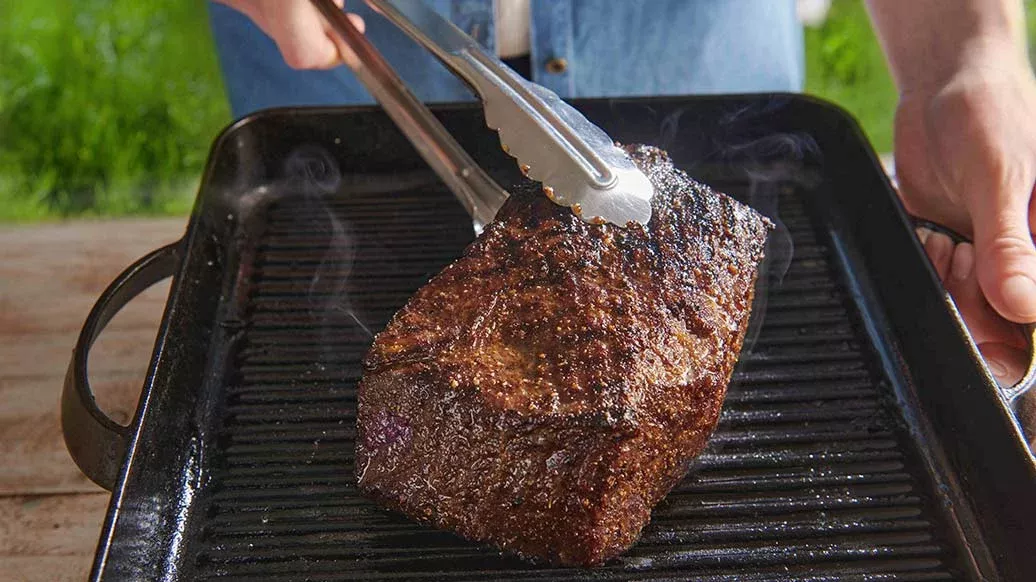 Leg het vlees op de grill en laat het 30 - 40 minuten garen, afhankelijk van de gewenste gaarheid, onder af en toe draaien. Laat het vlees na het garen nog 10 minuten of langer staan en snijd het dan in dunne plakjes.