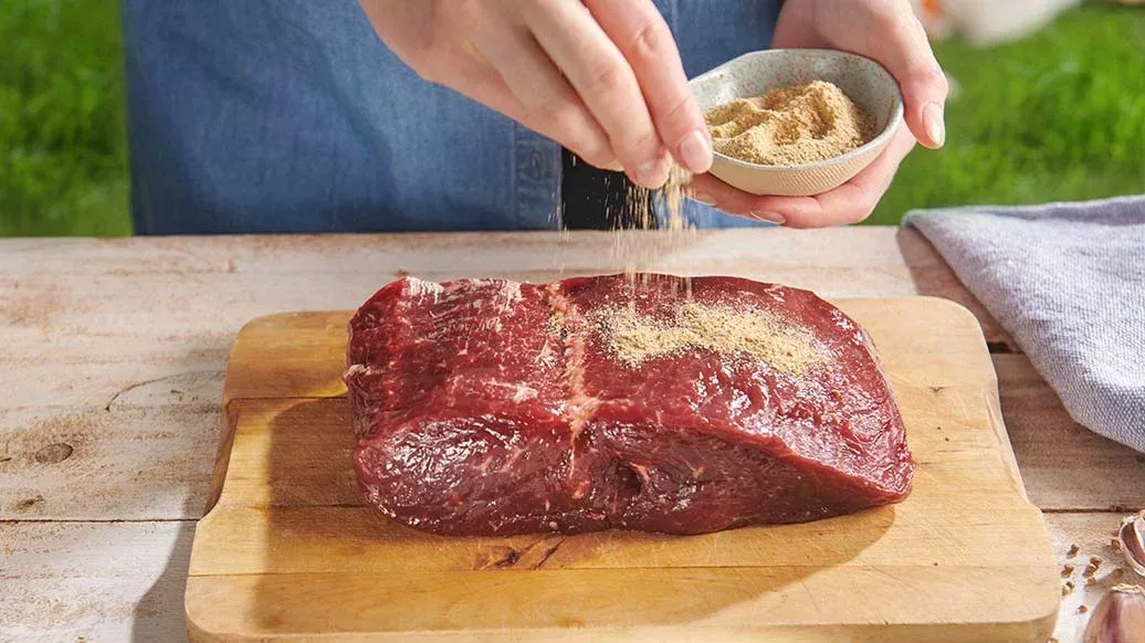 Haal het vlees uit de koelkast als het gemarineerd is en verwijder de marinade. Kruid het vlees aan alle kanten met het droge kruidenmengsel.
