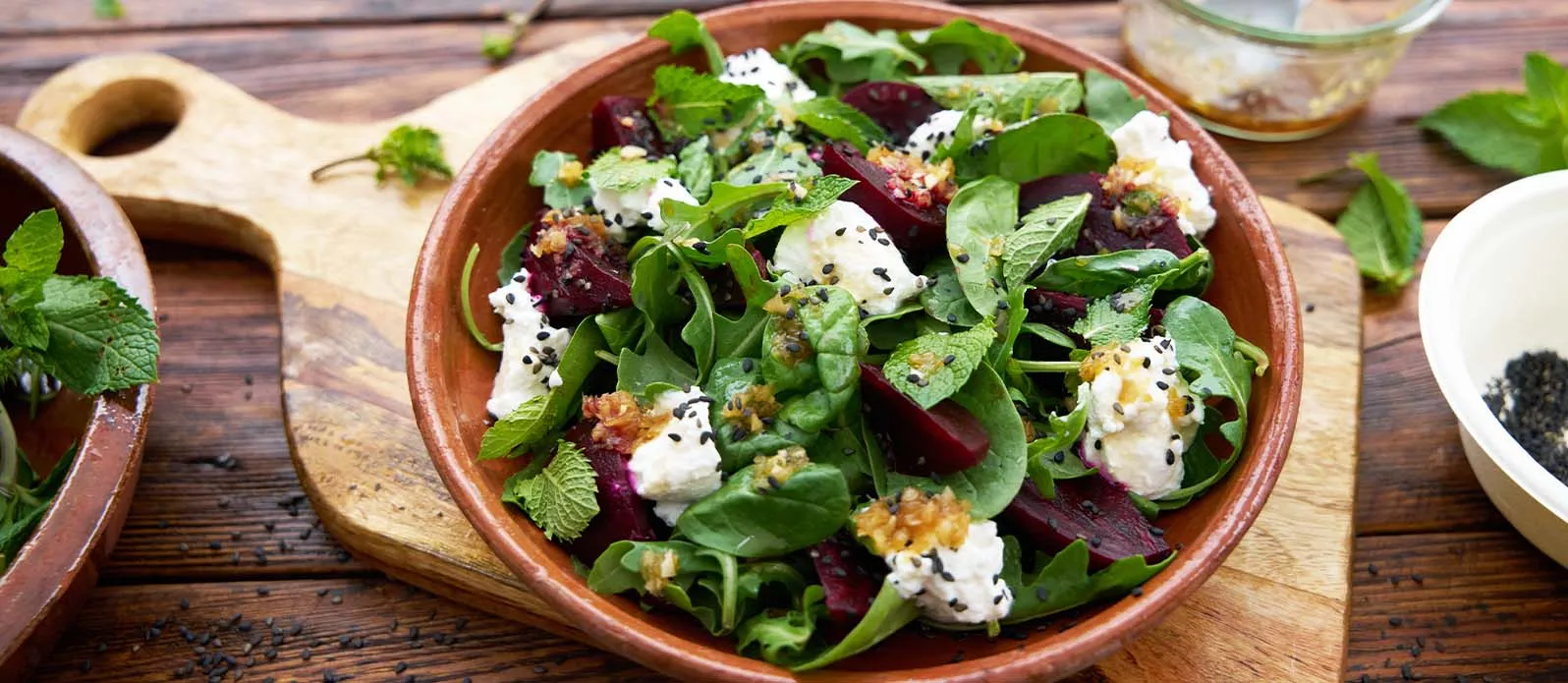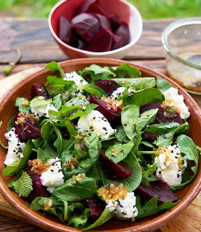 Snijd de geroosterde rode biet in partjes en schik deze op een bord. Breek de ricotta in kleine stukjes en verdeel deze over de biet, strooi er vervolgens de rucola en spinazie over. Besprenkel met de dressing, garneer met de muntblaadjes en bestrooi met de sesamzaadjes.