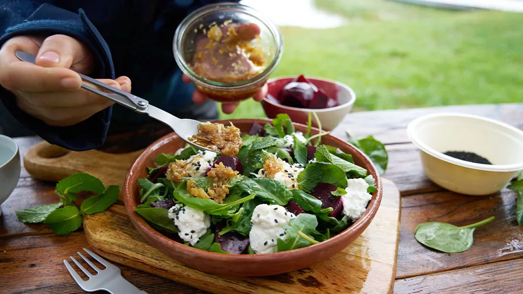 Zoete geroosterde rode biet met romige ricotta en een verfrissende dressing van Kikkoman Pokesaus en ingemaakte gember. Kleurrijk en voedzaam met een Japans tintje – perfect als lunch of bijgerecht.