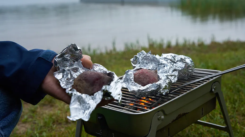 Was de rode biet, wikkel deze in aluminiumfolie en rooster hem 45-50 minuten op een barbecue tot hij gaar is, of in de oven op 180-200 °C.