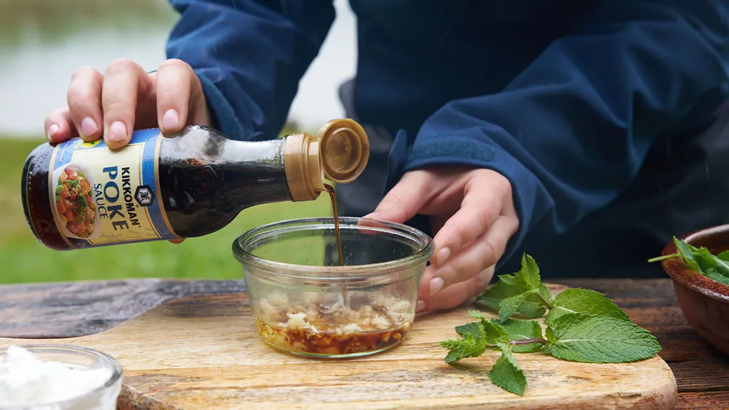 Hak de gember en knoflook fijn en meng dit met de Kikkoman Pokesaus en honing tot een dressing.