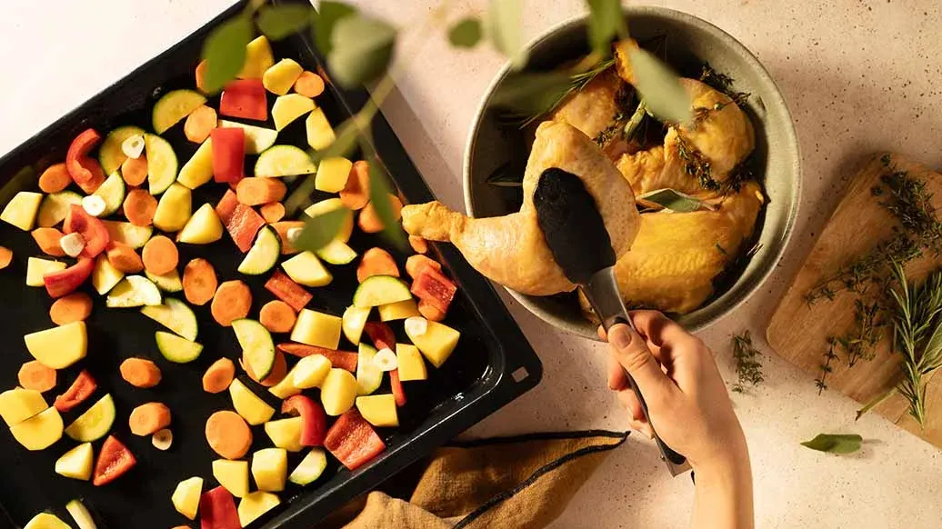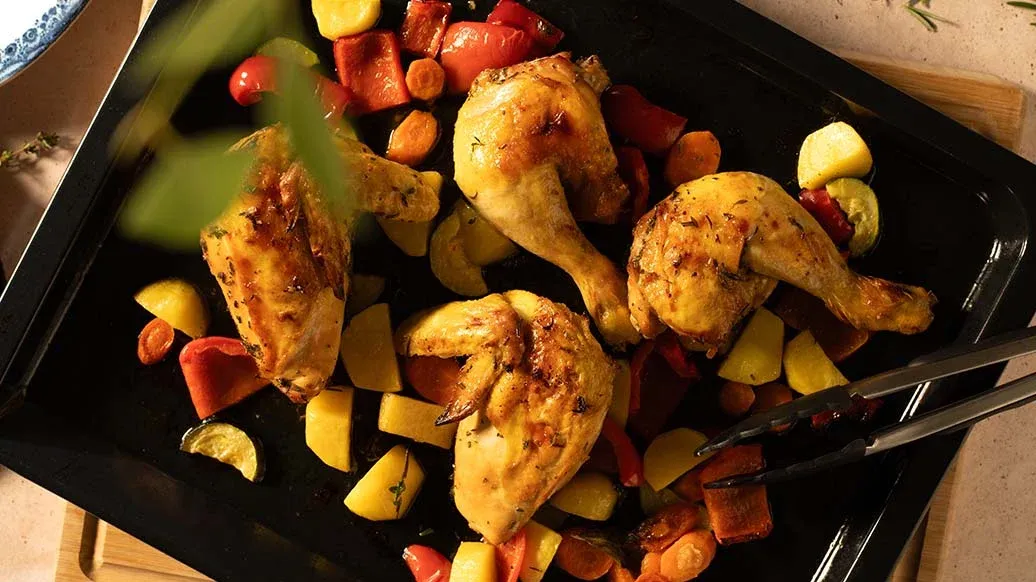 Bak 45-50 minuten in een voorverwarmde oven op 190°C, tot de kip helemaal gaar is en de groenten zacht en lichtbruin zijn. Serveer warm.