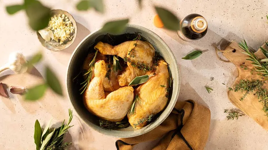 Kip gemarineerd in zoete sojasaus met Provençaalse kruiden, geroosterd met knoflook en groenten voor een subtiele mix van zoete en aromatische smaken.