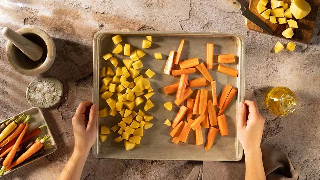 Meng de aardappelen en wortelen met de olijfolie, zout en peper. Verdeel ze over een aparte bakplaat en rooster ze in een voorverwarmde oven van 200°C in ongeveer 40 minuten zacht en lichtbruin.