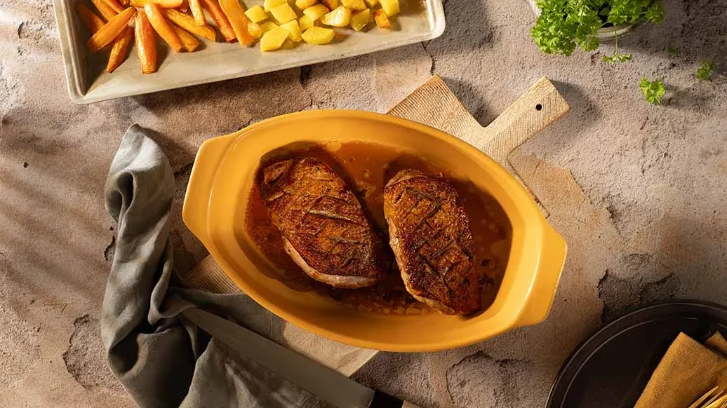 Bak de eendenhuid goudbruin en krokant voordat je ze braadt. De kooktijd kan variëren, afhankelijk van de grootte van de borsten en hoe gaar je ze wilt hebben.
