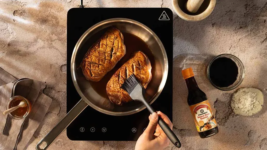 2 eendenborsten – Salt and freshly ground black pepper – 4 el Kikkoman zoete Sojasaus – 2 tl honing of ahornsiroop – 1 tl Kikkoman Geroosterde Sesamolie