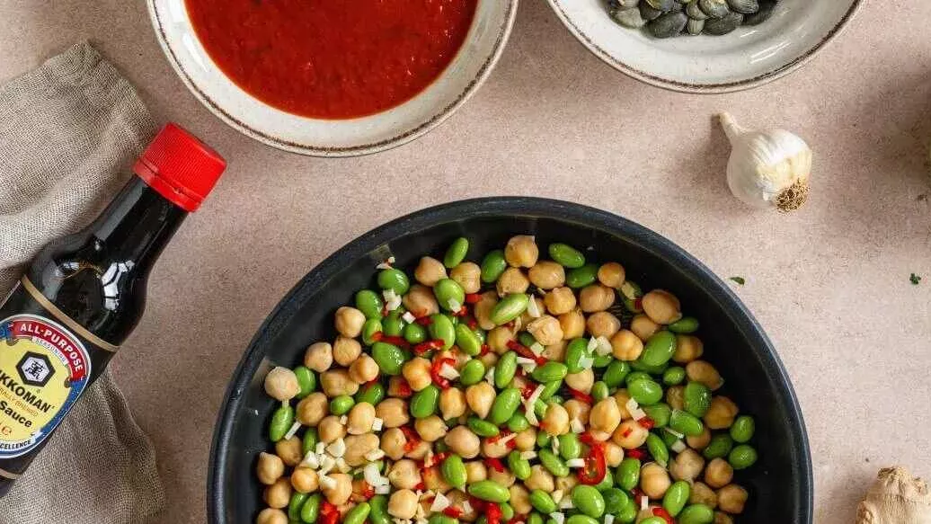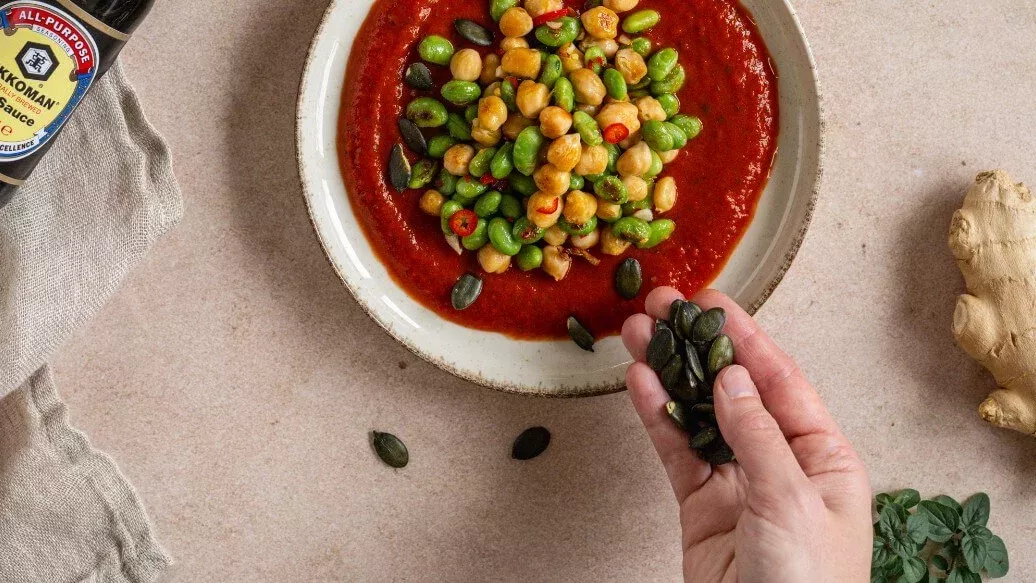 Kikkererwten en edamame in een pittig jasje, geserveerd met een rijke saus met paprika: een geweldig idee voor een verwarmende wintermaaltijd.