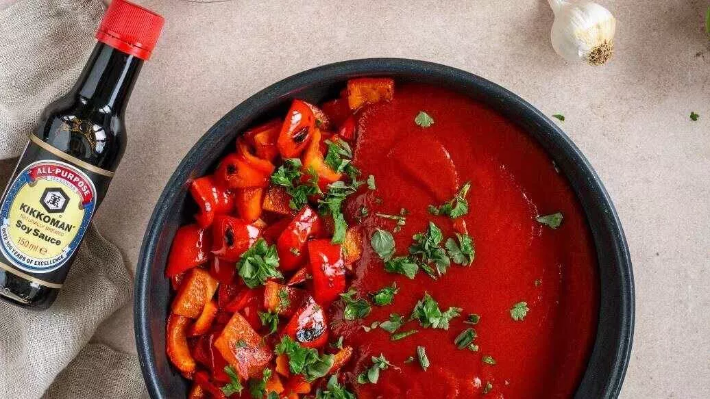 Bak de paprikablokjes in olijfolie. Voeg de kruiden en tomatenpassata toe zodra het vel van de paprikablokjes donker wordt. Laat 10 minuten sudderen, breng op smaak met Kikkoman Sojasaus en peper en mix tot een gladde saus.