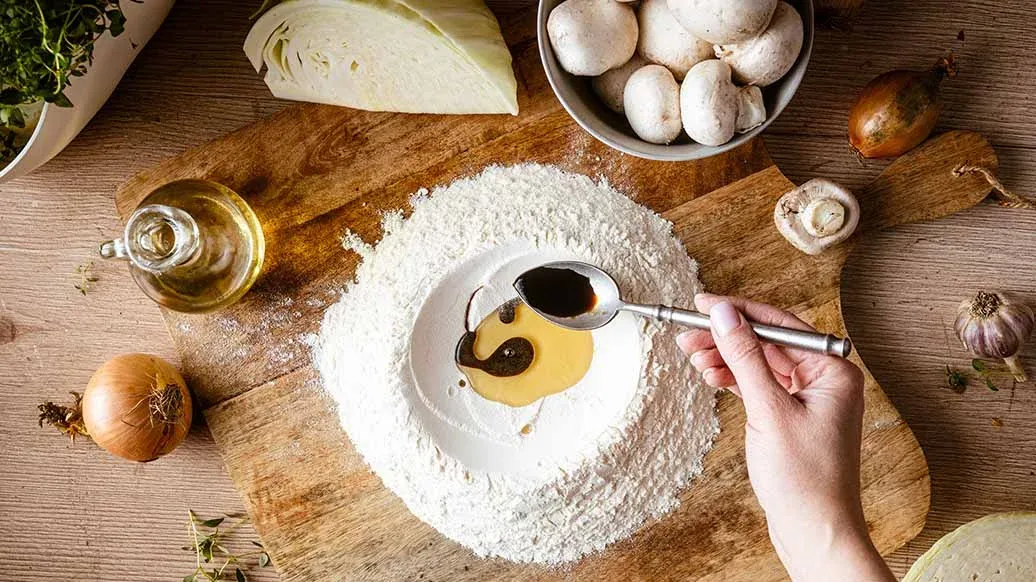 Strooi de bloem op een werkblad en maak een kuiltje in het midden. Voeg de olie, Kikkoman Sojasaus en warm water toe. Meng en kneed tot het deeg glad en elastisch is. Dek het deeg af met een kom en laat het ongeveer 20 minuten rusten.