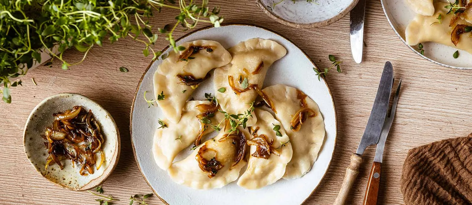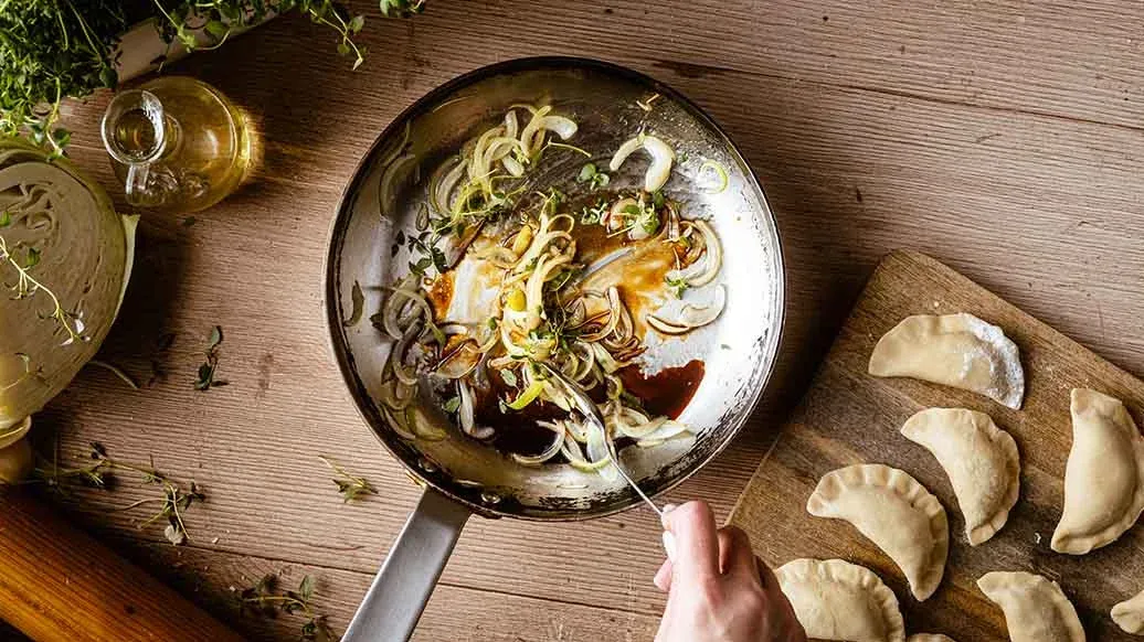 Snijd de ui in dunne partjes en fruit deze in de olie. Voeg de honing, Kikkoman Sojasaus en de helft van de tijmblaadjes toe. Serveer de dumplings met de gekarameliseerde ui en bestrooi ze met de resterende tijmblaadjes.
