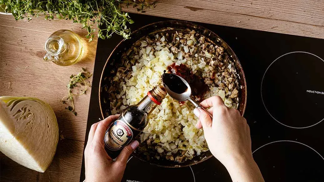 Handgemaakte dumplings gevuld met witte kool, champignons en ui. Kikkoman Sojasaus en Kikkoman Kimchi Chilisaus voegen een intense umami-smaak en een milde pittigheid toe, waardoor dit eenvoudige gerecht verandert in een hartverwarmend, huiselijk gerecht.
