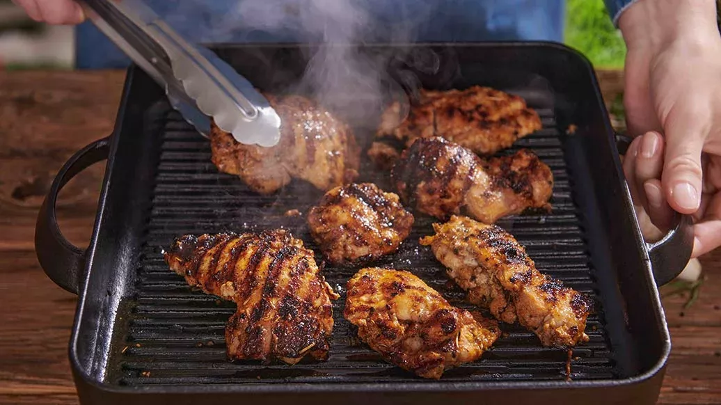 2 el natuurlijke yoghurt – 4 el Kikkoman Ponzu - een Mengsel van Sojasaus, azijn en citroensmaakstof – 3 teentjes knoflook – 1 tl oregano – 1 tl gemalen zoete paprika – ½ tl gedroogde rozemarijn – ½ tl komijn – 1 tl zwarte komijn – 400 g kippendijen (zonder vel en zonder bot)